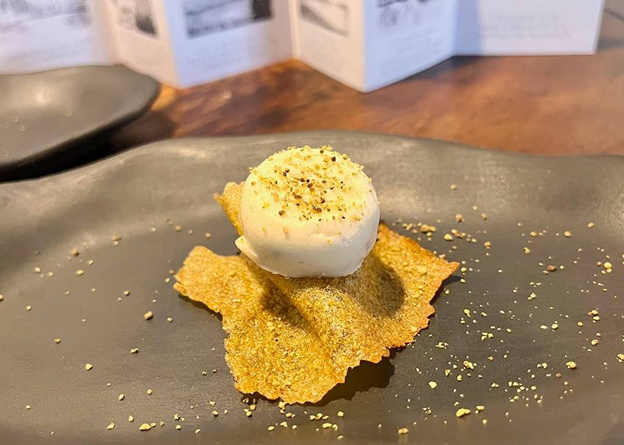 Finaliza con el Bombón de la afamada cabra payoya de Grazalema, acompañado de un crujiente de manzana Golden, un broche de oro para tu experiencia culinaria.