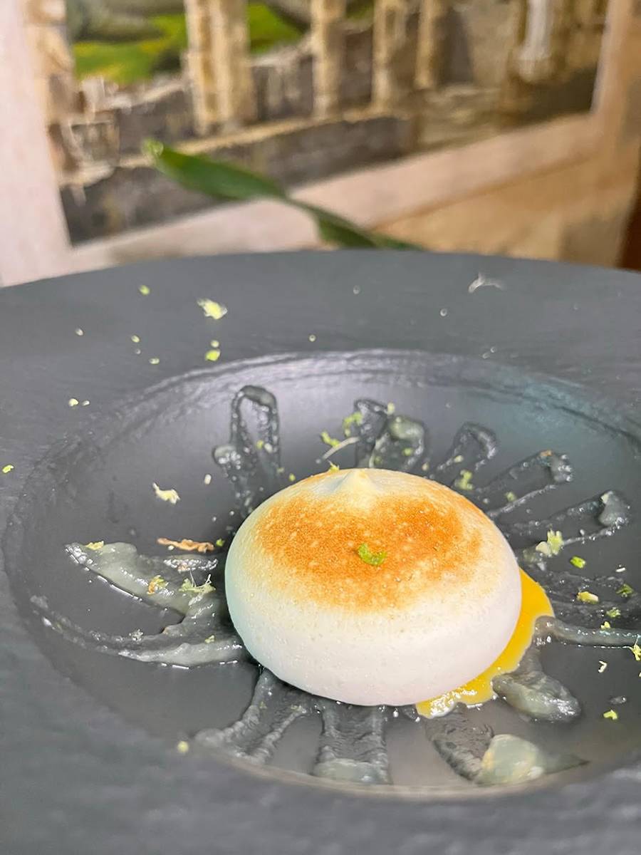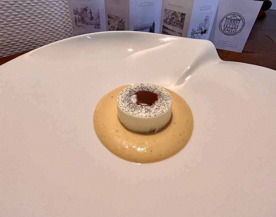 Deléitate con la Cuajada con aroma a vainilla, caramelo salado y espuma de plátano maduro con Pedro Ximenez, una experiencia dulce y reconfortante.