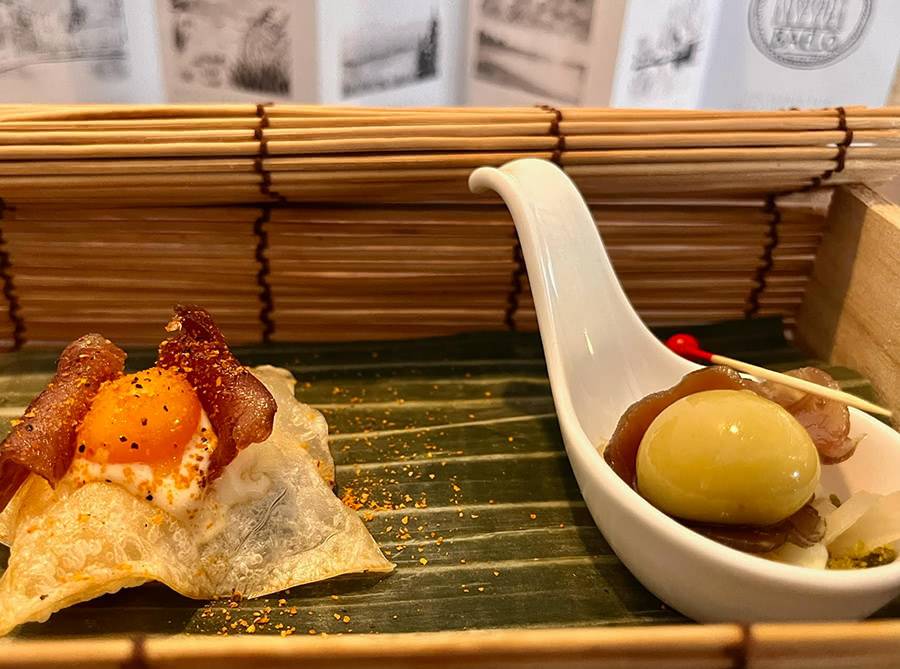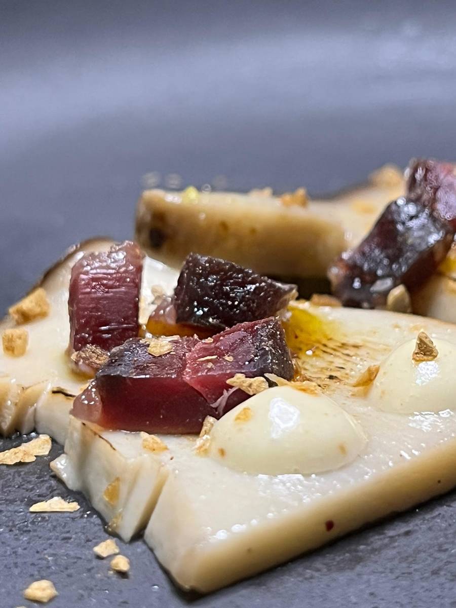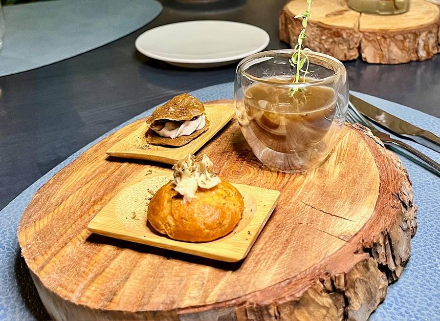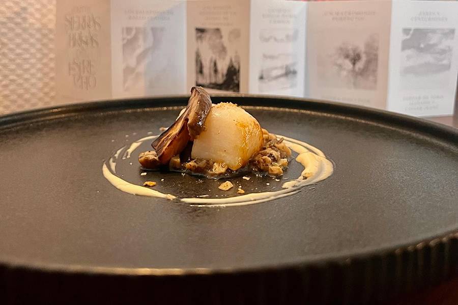 Continúa con los exquisitos hongos otoñales de la Sierra de Guadarrama, presentados en una Infusión de setas con su galleta y un buñuelo muy castizo, una delicia para el paladar.